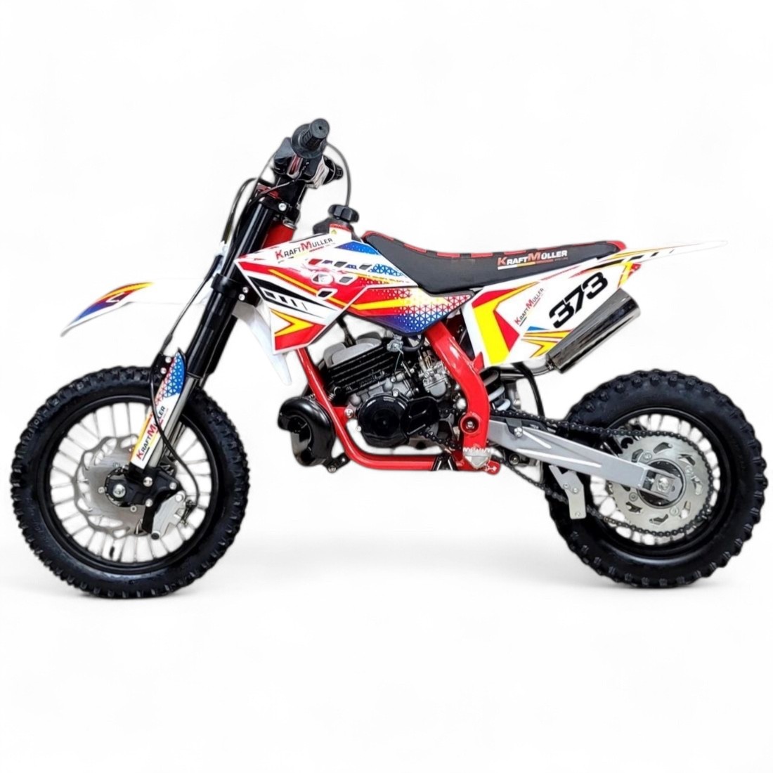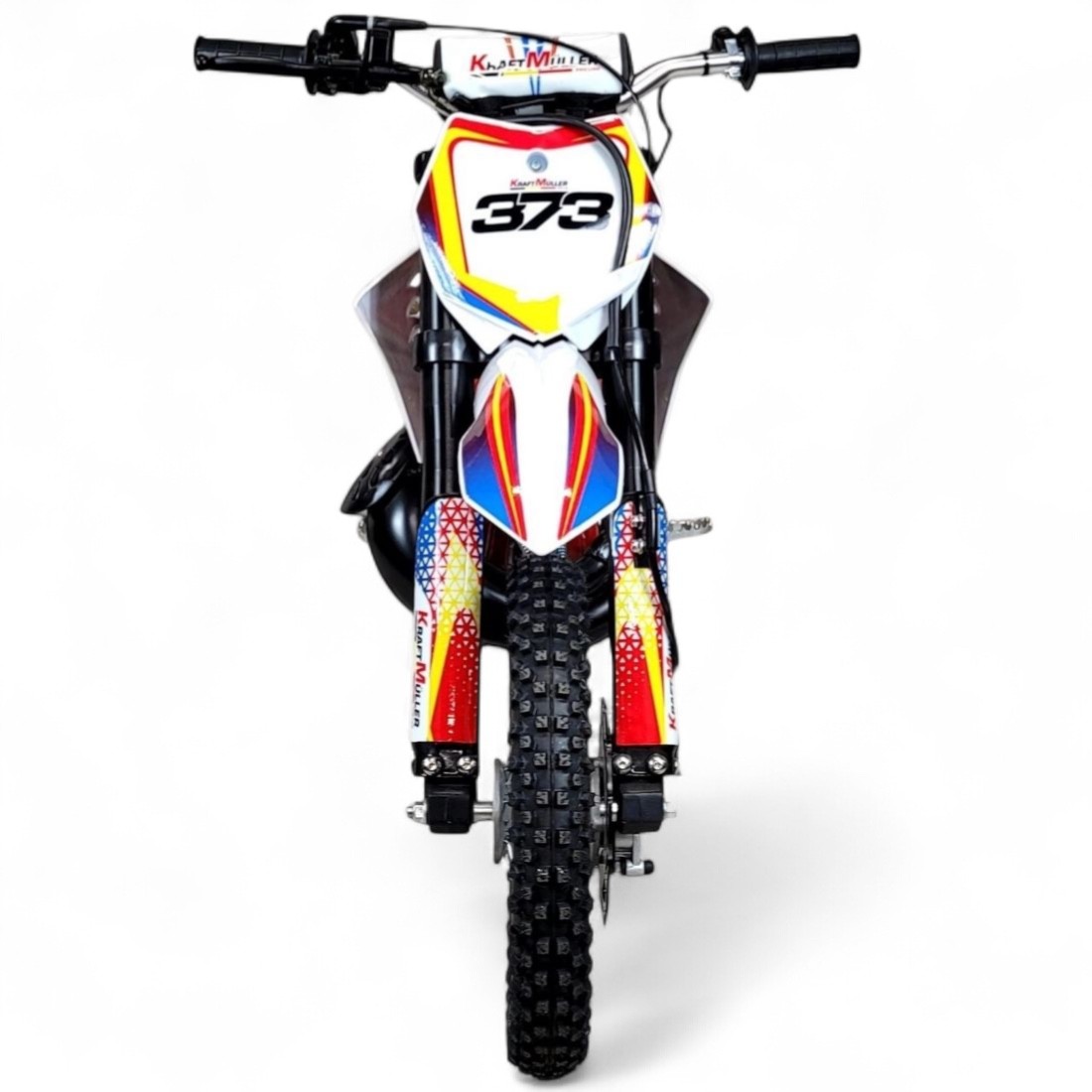 Elle possède un vrai moteur 2 temps FRANCO MORINI 9 cv style KTM avec démarrage au kick.