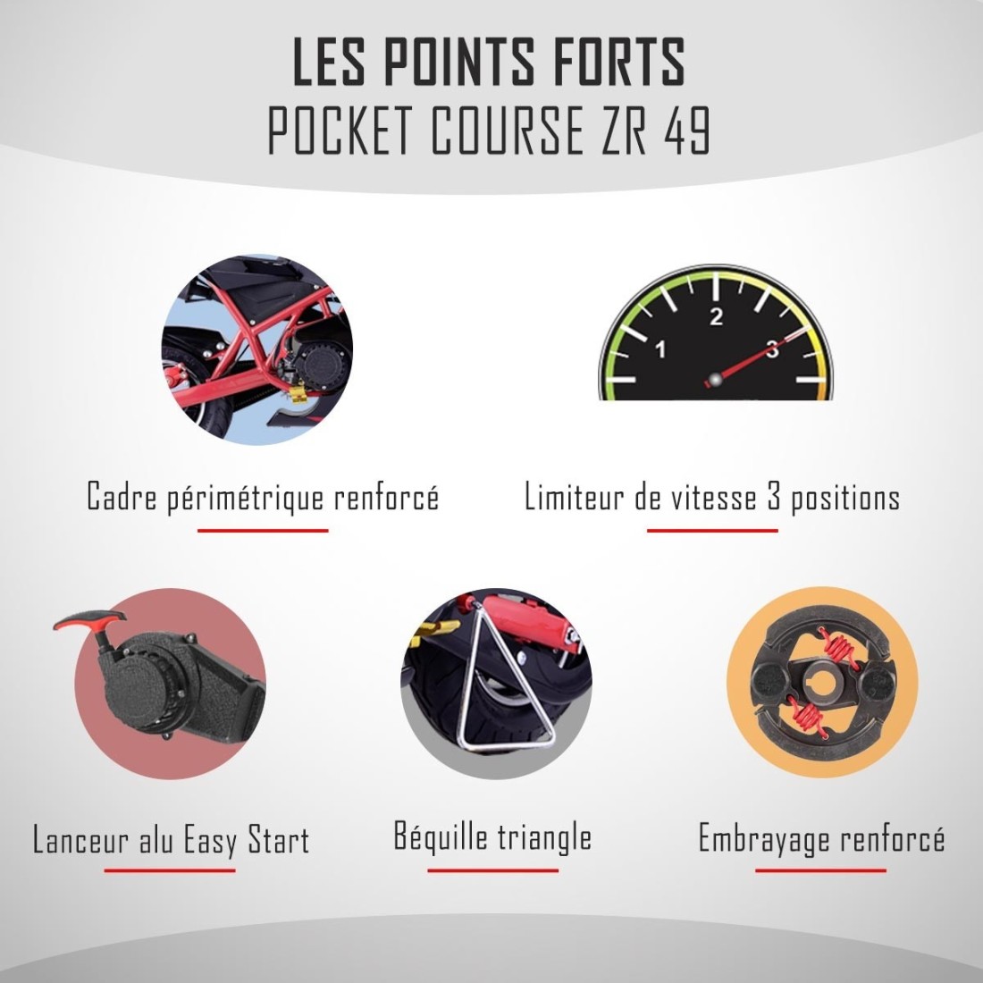 La pocket course 49cc ZR est équipée d'un moteur monocylindre 49cc 2T à reffroidissement par air.