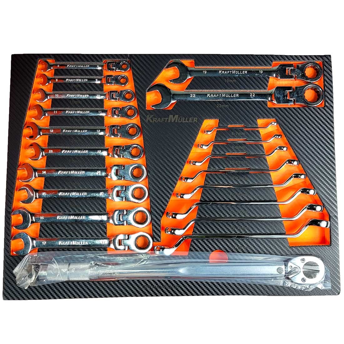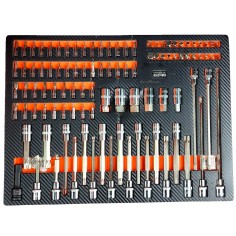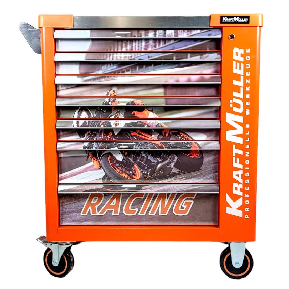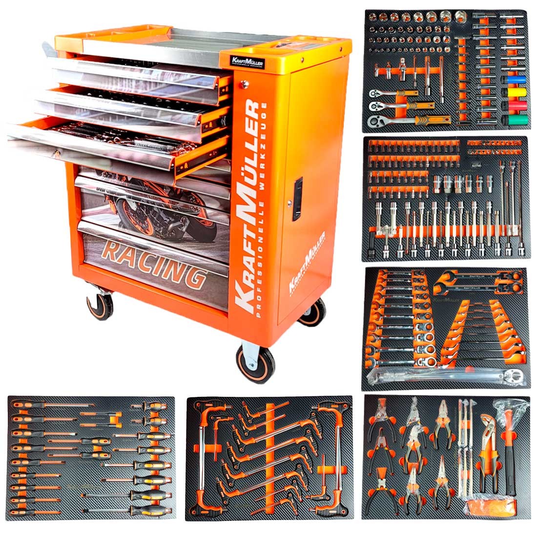 Cette servante d'atelier se compose de 7 tiroirs pleins d’outils de qualité professionnelle : 540 pièces de la marque de renommée allemande Kraft Müller, rangées par types et par tailles dans des compartiments en mousse Eva :