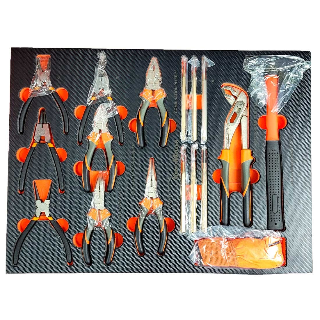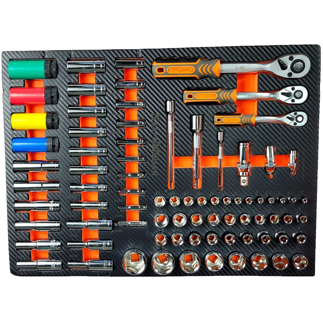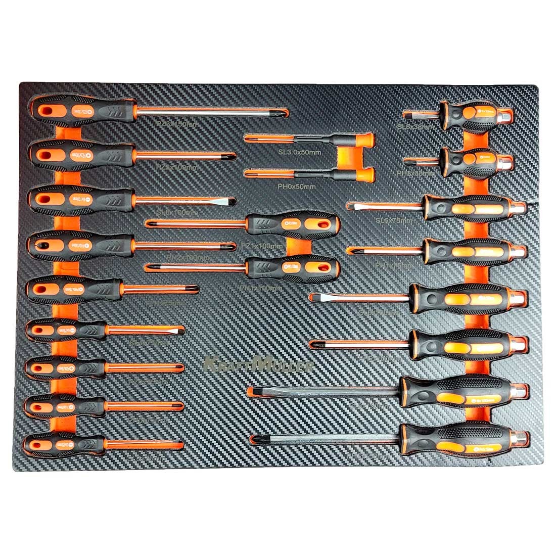 Cette servante d'atelier se compose de 7 tiroirs pleins d’outils de qualité professionnelle : 540 pièces de la marque de renommée allemande Kraft Müller, rangées par types et par tailles dans des compartiments en mousse Eva :